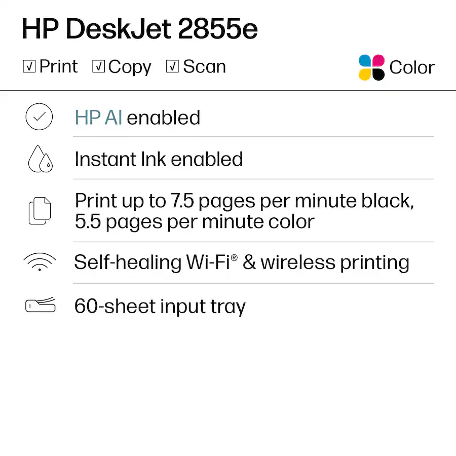 Smart, Simple, and Reliable Printing with the HP DeskJet 2855e AI-Enabled All-in-One Printer.